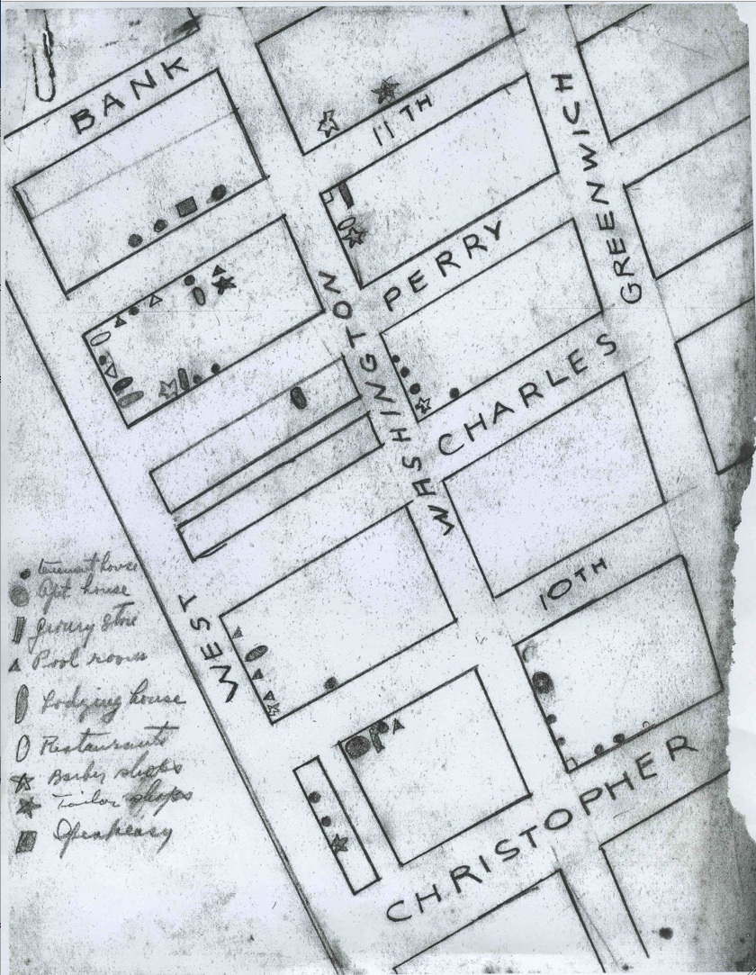 Mapa que acompaña las notas de campo -referidas a los españoles- de Caroline Ware. La leyenda escrita a mano precisa varias localizaciones: casas de húespedes, apartamentos, tiendas de comida, salas con piscina, albergues, restaurantes, barberos, tiendas de confección y tabernas.